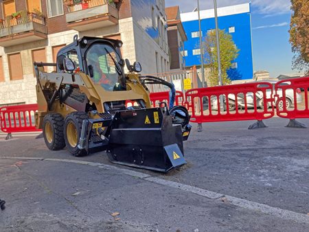 Die Radfräsen Simex für Anbau an Kompaktlader sind für das Fräsen von harten und festen Oberflächen wie Asphalt, Zement oder Gestein entwickelt. Schmale Schlitze und Gräben, Gräben definierter Breite, schmale Gräben für die Verlegung von Glasfaserkabeln. Maximale Arbeitssicherheit durch die vollständige Abdeckung des Fräsrads bei jeder Frästiefe.