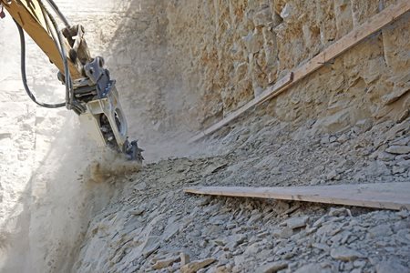 Excavation of a trench for laying of sewers and milling on a vertical rock wall: Simex TFC 400 cutter head with continuous cutting at work near Ascoli, Italy.